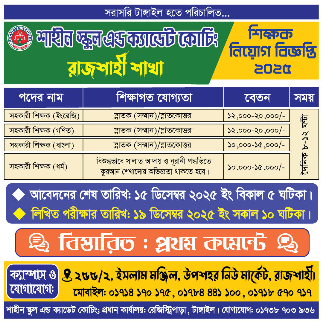 👉জাতীয় পর্যায়ে চারবার প্রথম স্থান অর্জনকারী শিক্ষাপ্রতিষ্ঠান টাঙ্গাইলের ঐতিহ্যবাহী শাহীন স্কুল এন্ড ক্যাডেট কোচিং, রাজশাহী শাখায় ইংরেজি(গ্রামার/স্পোকেন ইংলিশ), গণিত, বাংলা ও ইসলাম ধর্ম পাঠদানে পারদর্শী, পরিশ্রমী ও অধূমপায়ী সহকারী শিক্ষক হিসেবে আবেদন করতে পারবেন ।