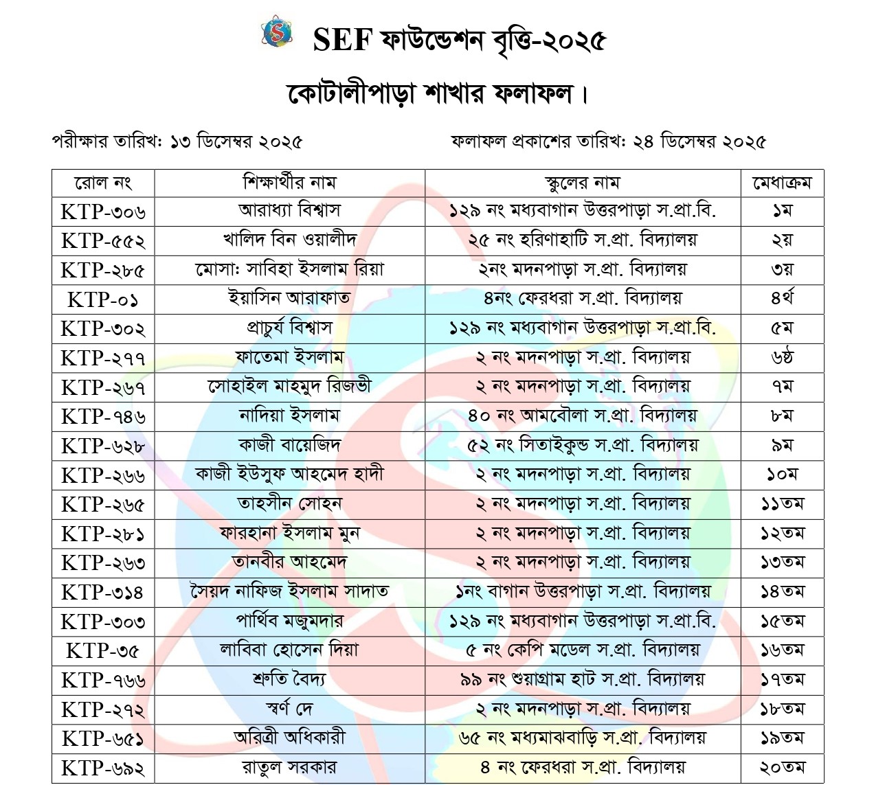 SEF ফাউন্ডেশন বৃত্তি পরীক্ষার ফলাফল,কোটালীপাড়া শাখা - ২০২৫