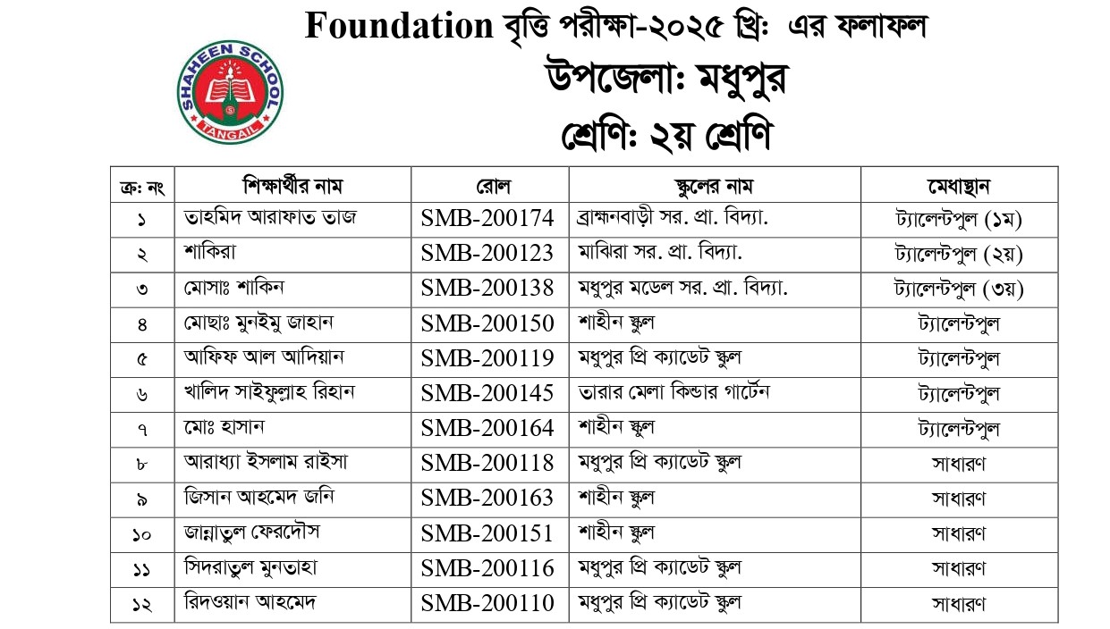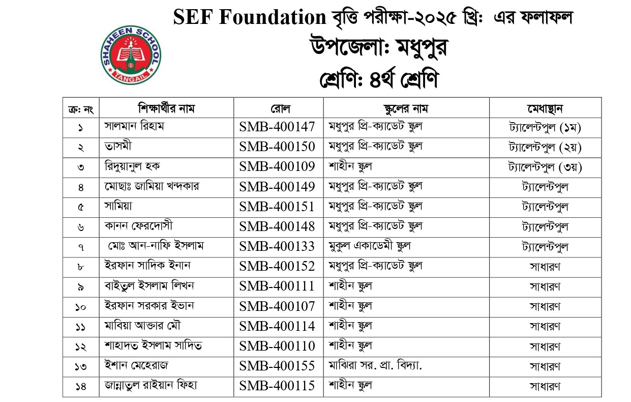 SEF ফাউন্ডেশন বৃত্তি পরীক্ষার ফলাফল, মধুপুর শাখা - ২০২৫
