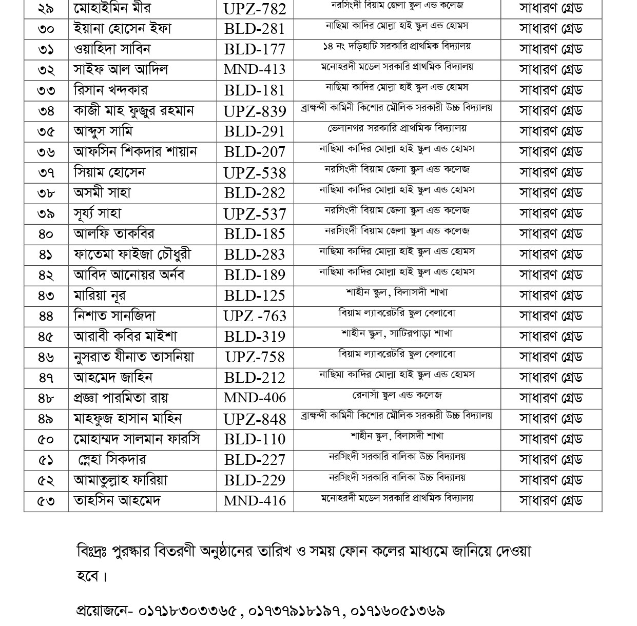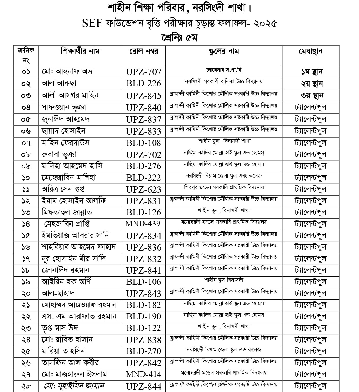 SEF ফাউন্ডেশন বৃত্তি পরীক্ষার ফলাফল,নরসিংদী শাখা - ২০২৫