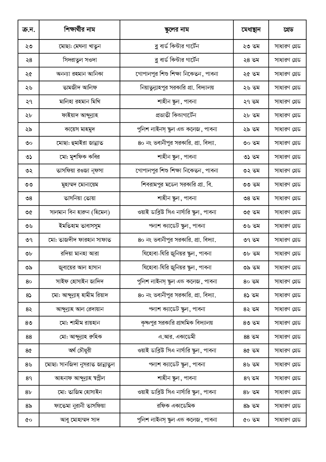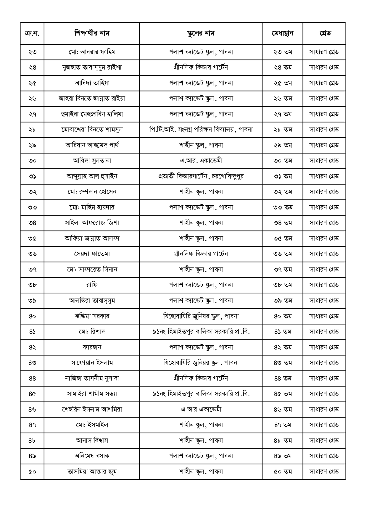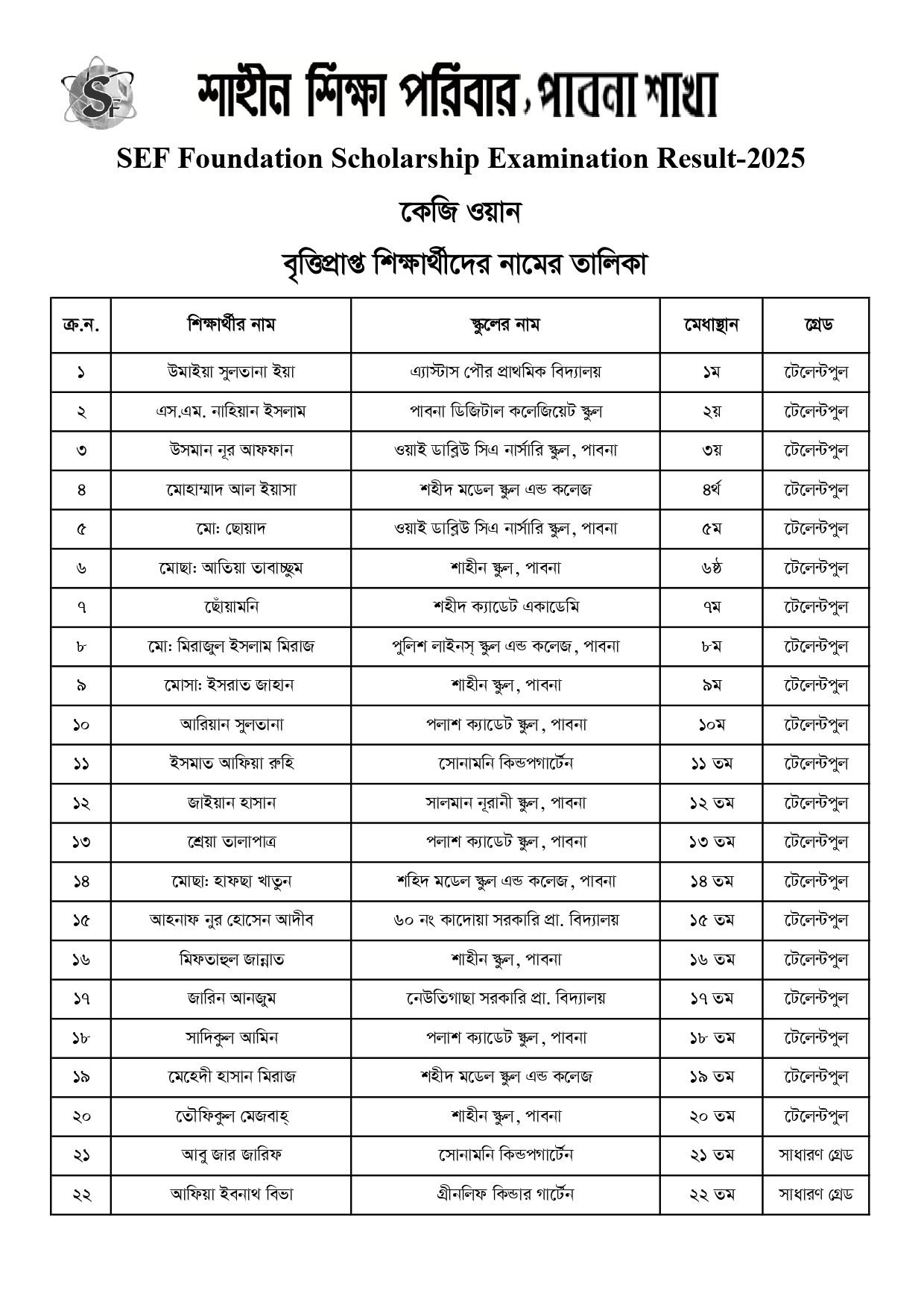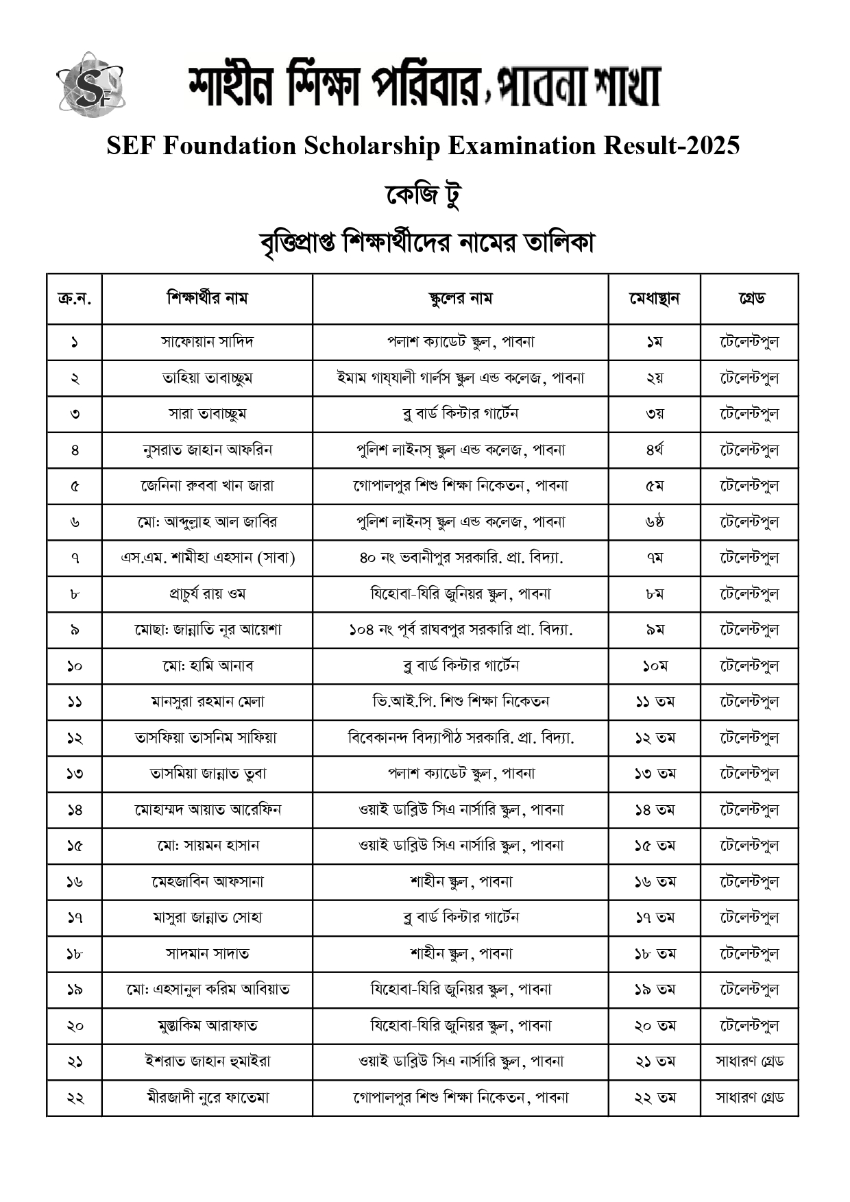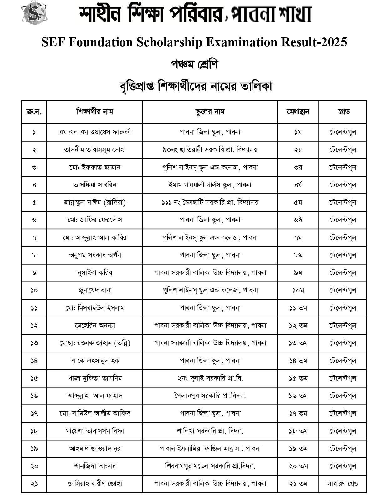 SEF ফাউন্ডেশন বৃত্তি পরীক্ষার ফলাফল,পাবনা শাখা - ২০২৫